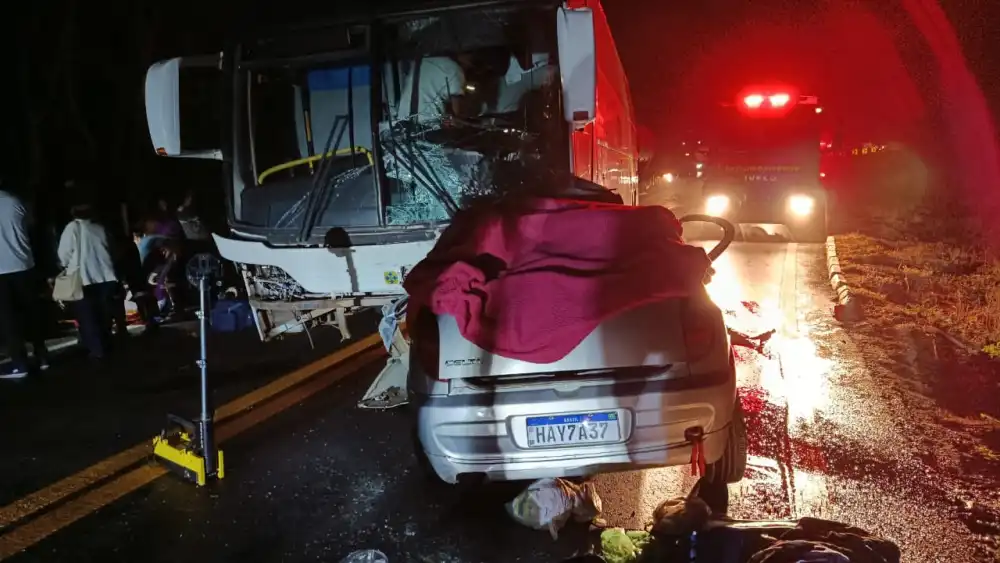 A corporação informou ainda que os veículos bateram de frente e que parte do carro ficou debaixo do coletivo, que transportava romeiros.