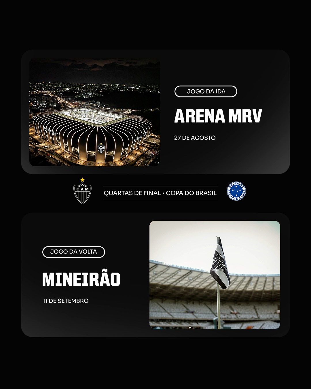 O Atlético e o Cruzeiro vão se enfrentar nas quartas de final da Copa do Brasil! A definição do confronto aconteceu em sorteio realizado pela CBF na manhã desta terça-feira (12 de agosto) no Rio de Janeiro. O primeiro jogo será na Arena MRV!